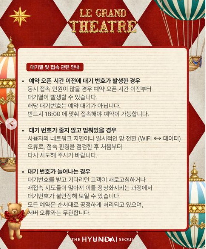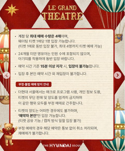 - 더현대 서울에서는 매크로 프로그램 사용, 갱인 정보 도용, 티켓의 무단 판매 및 양도를 엄격히 금지하고 있습니다. 따라서 이 같은 행위 모두를 부정 예매로 간주합니다.