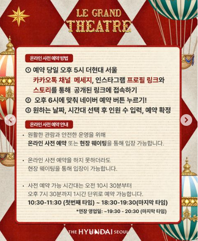- 예약 당일 오후 5시 더현대 서울 카카오톡 채널 메세지, 인스타그램 프로필 링크와 스토리를 통해 공개된 링크에 접속하기