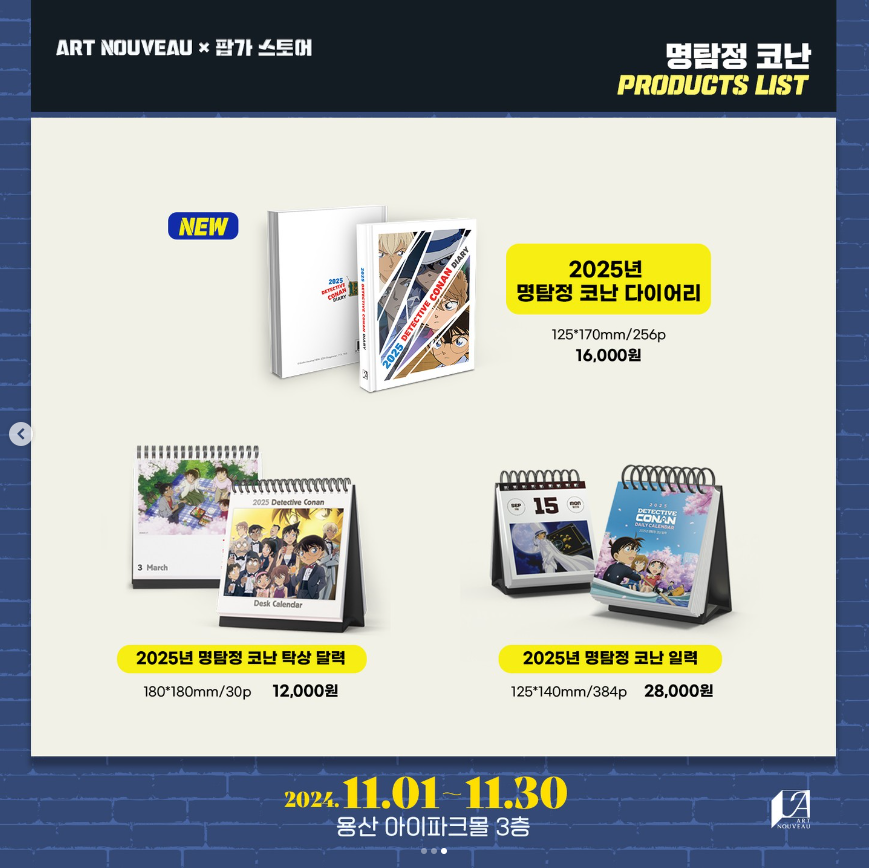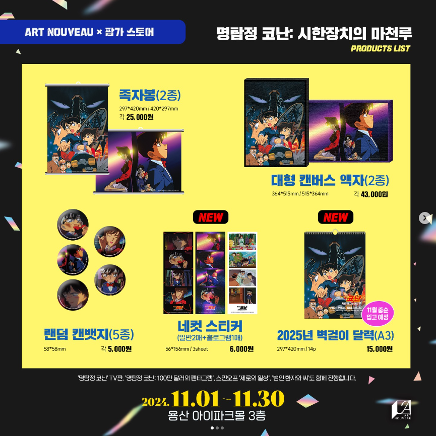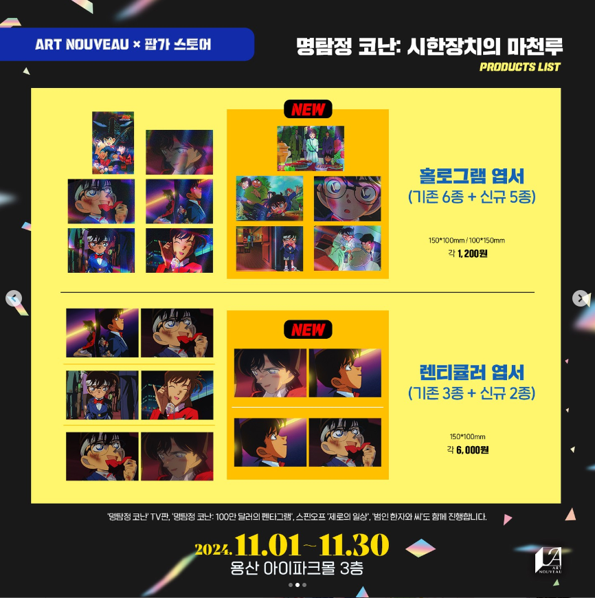 용산 아이파크몰 3층에 인기 IP 편집샵인 팝가스토어가 운영됩니다. 국내 최대 멀티 IP샵이라고 하는데요. 짱구, 디즈니, 산리오 등등 국내 인기있는 캐릭터의 굿즈들을 구경할 수 있다고 합니다. 이 팝가스토어에서 11월동안 명탐정 코난 굿즈가 입점되어 운영됩니다. 신제품들도 같이 입점되었다고 하니 관심있으신 분들은 확인해보세요!