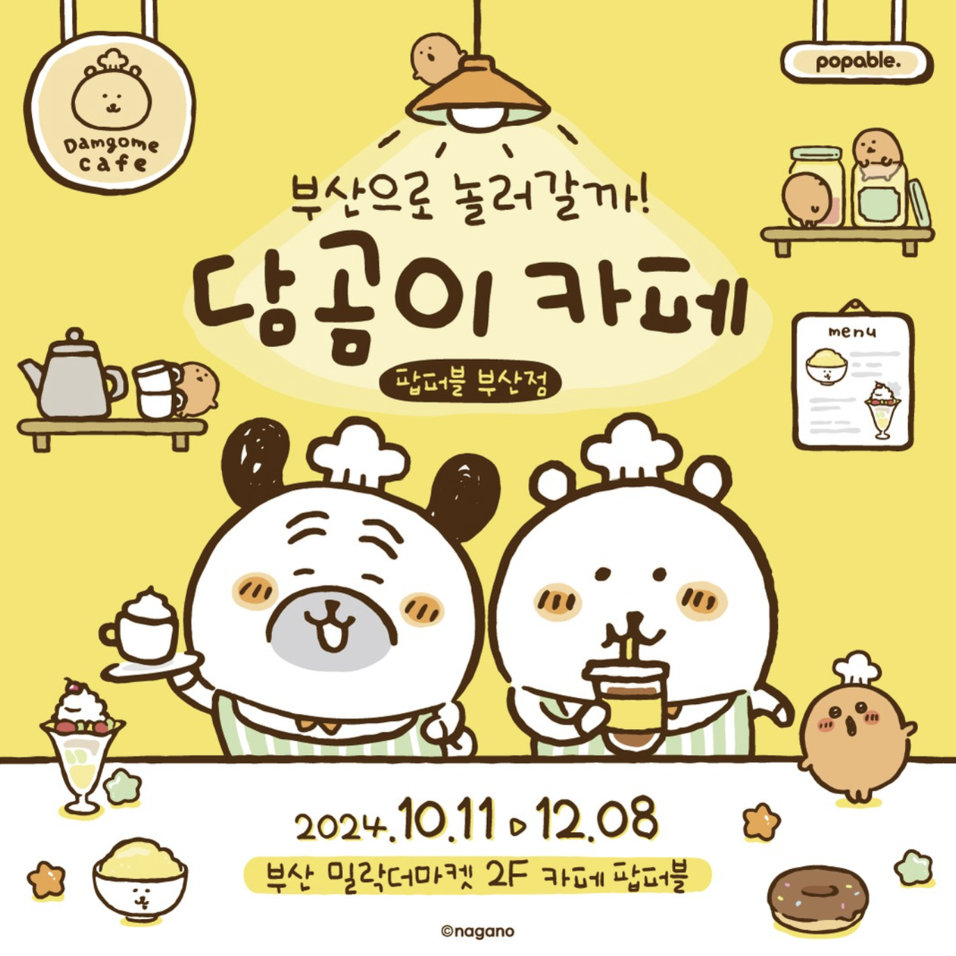 안녕하세요! 팝퍼블 부산점에서 현재 담곰이 카페를 운영하고 있는데요. 10월11일부터 시작하여 12월 8일까지 진행하는 카페입니다. 현재 오픈 전 현장 대기는 진행하지 않고 있고 오픈 시간인 10시부터 순차적으로 입장이 가능하다고 하니 관심있으신 분들은 운영이 끝나기 전에 방문하시면 여유롭게 즐기실 수 있을 것 같습니다. 카페는 영수증 발급시간으로부터 1시간 이용 가능하고 11월 중에는 담곰이 디저트 스푼포크도 출시된다고 하니 원하는 굿즈가 있다면 확인 후 방문하시면 될 것 같습니다!