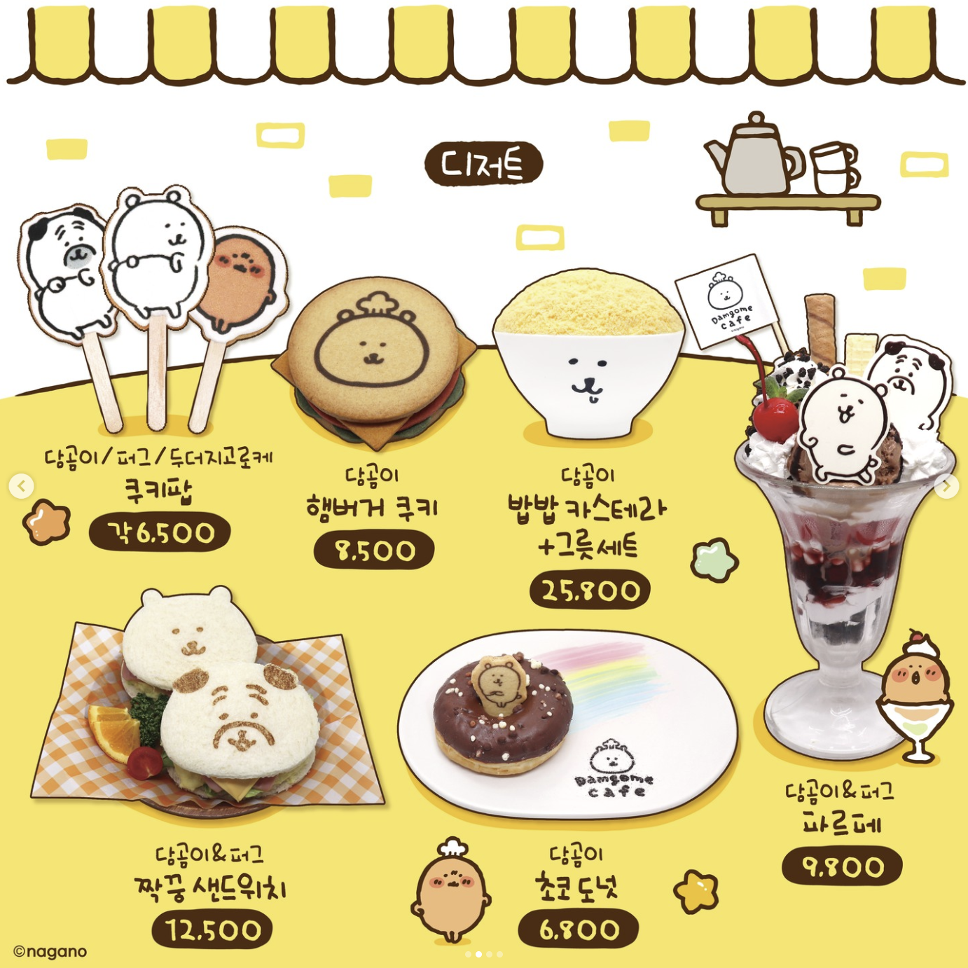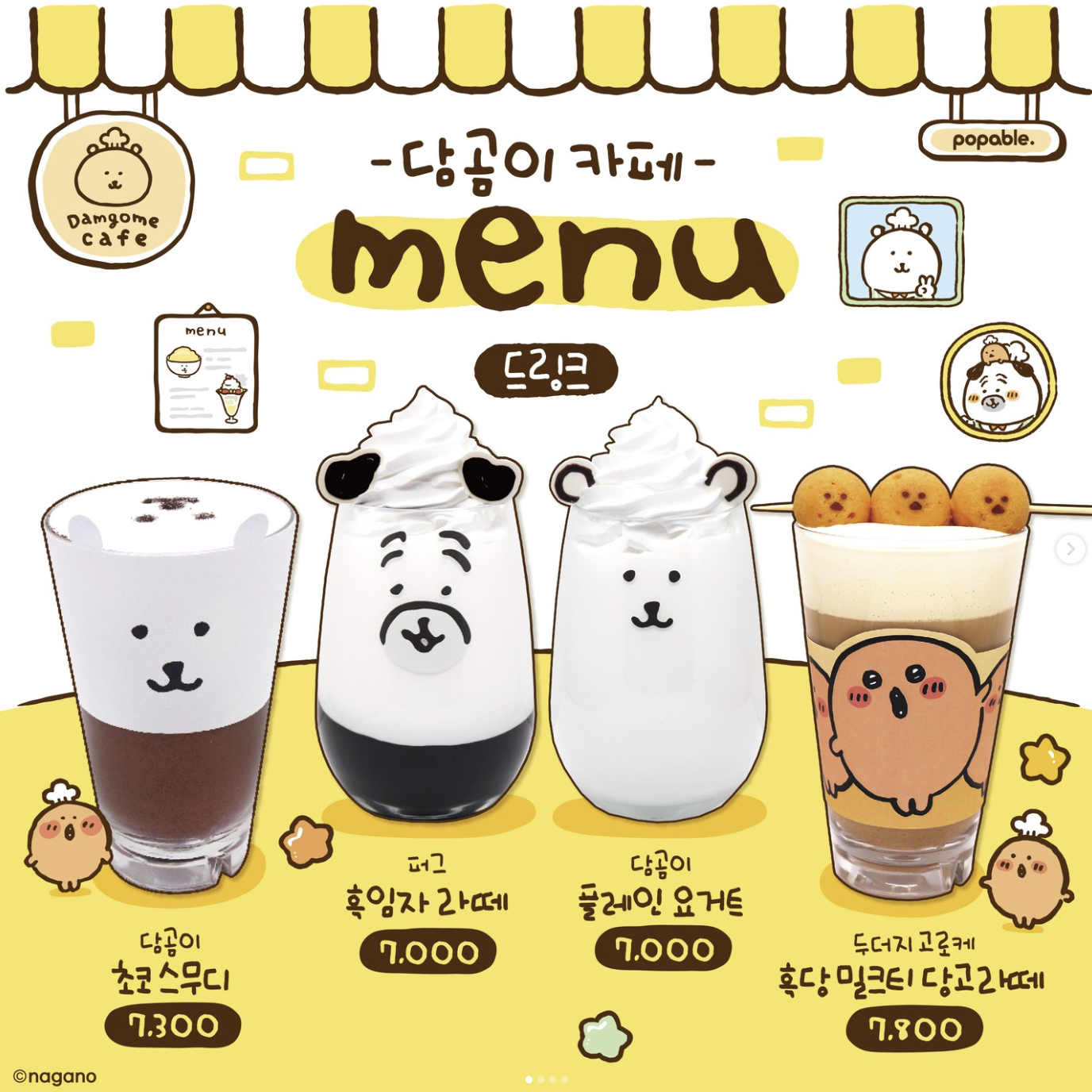 담곰이 초코스무디, 퍼그 흑임자 라떼, 담곰이 플레인 요거트, 두더지 고로케 흑당 밀크티 당고 라떼
