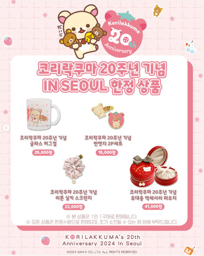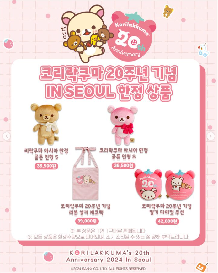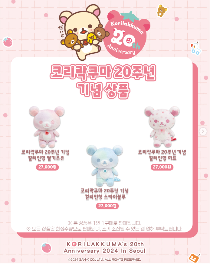 코리락쿠마 20주년 기념 커러 인형 딸기우유, 코리락쿠마 20주년 기념 컬러인형 스카이블루, 코리락쿠마 20주년 기념 컬러인형 하트, 리락쿠마 아시아 한정 골든 인형 S, 코리락쿠마 20주년 기념 리본 실키 에코백, 코리락쿠마 20주년 기념 딸기 다이컷 쿠션, 코리락쿠마 20주년 기념 글라스 머그컵, 코리락쿠마 20주년 기념 핀뱃지 2P세트, 코리락쿠마 20주년 기념 리본 실키 스크런치, 코리락쿠마 20주년 기념 휴대용 액세서리 파우치