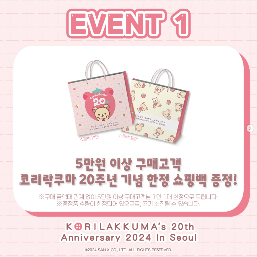 - 5만원 이상 구매고객 : 코리락쿠마 20주년 기념 한정 쇼핑백 증정 (재고 소진 시 종료)