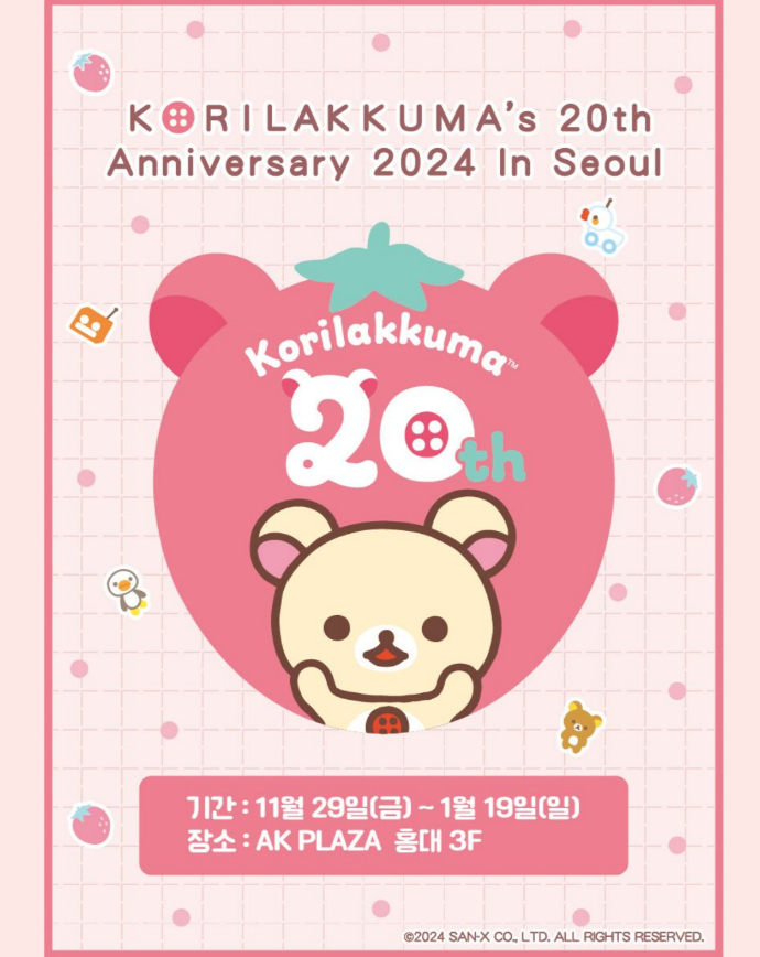 코리락쿠마 20주년을 기념하여 홍콩, 싱가폴, 말레이시아, 대만 그리고 한국에서 동시에 팝업을 개최한다고 합니다. 귀여운 코리락쿠마 한정 상품과 국내에서 만나기 힘든 각종 신상품을 만날 수 있다고 하는데요. 여러 구매 이벤트도 준비되어 있다고 합니다. 11월 29일부터 1월 19일까지 약 한달 반 정도 팝업스토어가 운영된다고 하니 리락쿠마를 좋아하시는 분들은 홍대 AK PLAZA에 들려보세요!