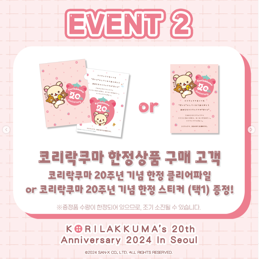 - 코리락쿠마 한정 상품 구매 고객 : 코리락쿠마 20주년 기념 한정 클리어파일 OR 코리락쿠마 20주년 기념 한정 스티커 (택 1) 증정 (재고 소진 시 종료)