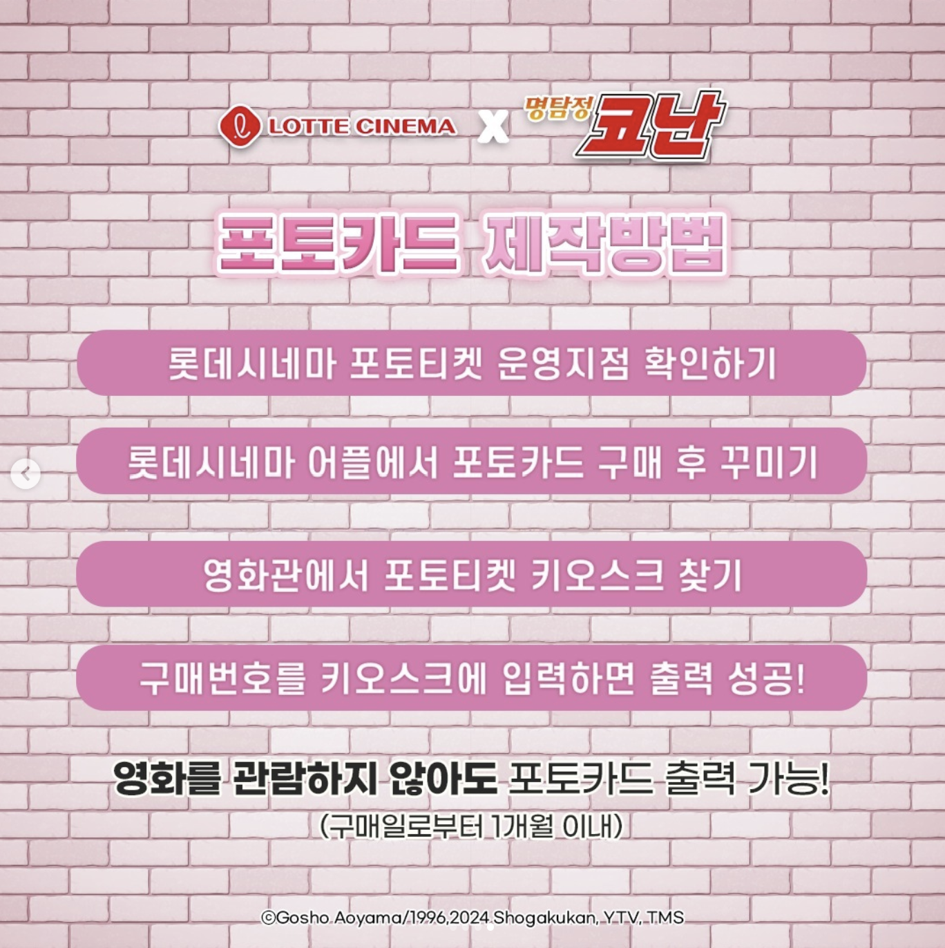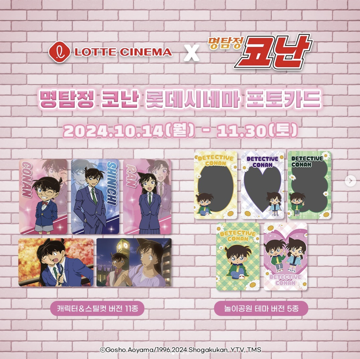 10월 14일부터 롯데시네마에서 명탐정 코난 포토카드를 뽑을 수 있습니다. 캐릭터 버전 8종과 스틸컷 버전 3종, 놀이공원 테마 버전 5종으로 총 16종의 포토카드를 뽑을 수 있고 원하는 문구와 사진을 넣어 출력이 가능합니다. 롯데시네마에서 나만의 명탐정 코난 포토카드를 만들어 보세요. 영화를 관람하지 않아도 구매일로부터 1개월 이내에 출력이 가능합니다. 자세한 사항은 아르누보 인스타그램에서 확인해보세요.